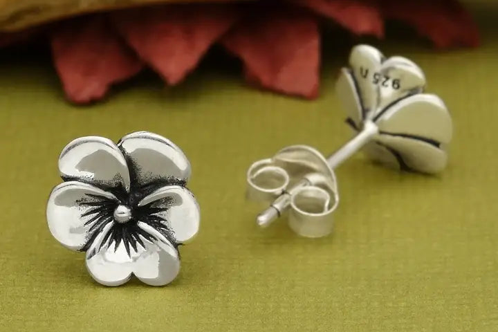 This sterling silver pansy post earring features delicately detailed, layered petals that are deeply oxidized to add depth and contrast. 8x8mm