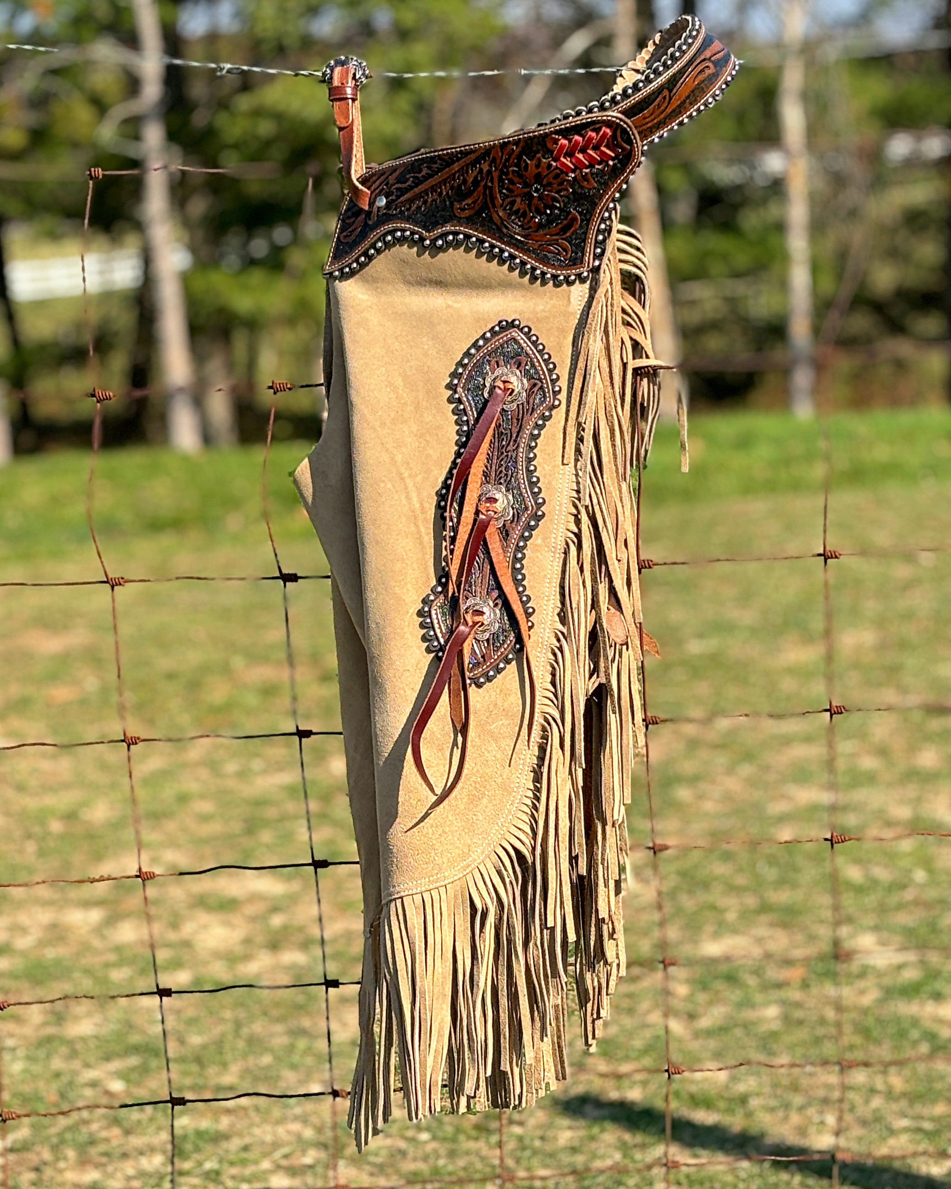 Introducing these Showman® exquisite tan chinks, crafted with the finest floral tooled leather and adorned with stylish fringe details. These chinks are designed to add a touch of Western flair to your outfit while providing functionality and durability for all your riding adventures.