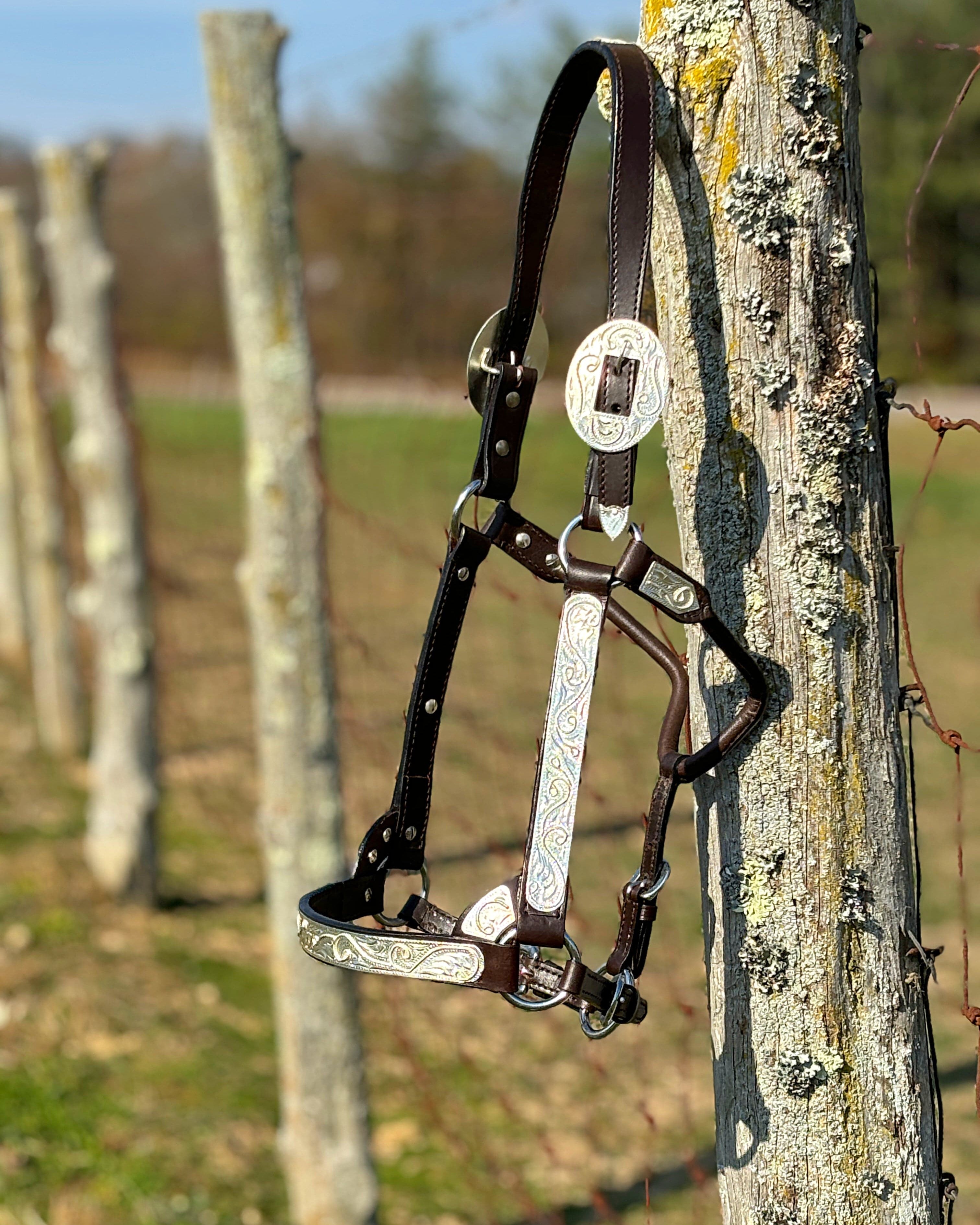 Outshine the competition with this elegant show halter. Expertly crafted from premium bridle leather with a smooth finished edge. Silver engraved nose and cheek pieces feature unique swirl and scroll designs. Complete with large matching crown buckles, tips, and details.