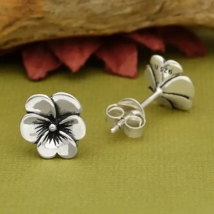 This sterling silver pansy post earring features delicately detailed, layered petals that are deeply oxidized to add depth and contrast. 8x8mm