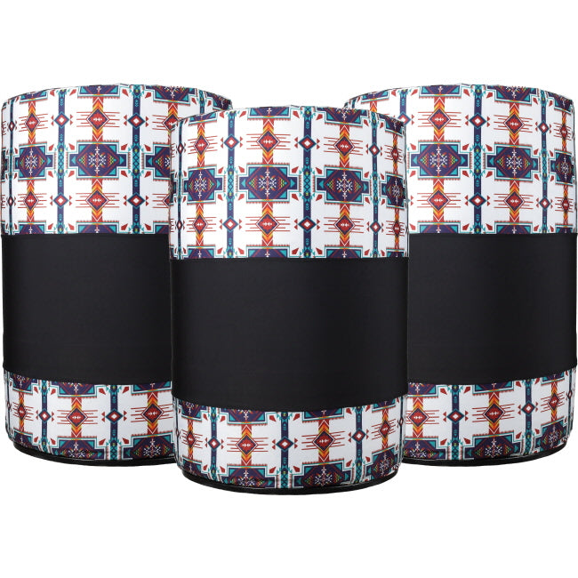 Add a touch of southwestern charm to your arena with the Showman® Sagebrush Lycra Barrel Covers - Set of 3. These stylish covers feature a cream-colored lycra base with a blue, rust, and green southwestern print, accented by a bold black stripe down the center for striking contrast. Made from durable, stretchy lycra, they’re designed to fit most standard-sized barrels with ease and slip on and off quickly, making setup a breeze.