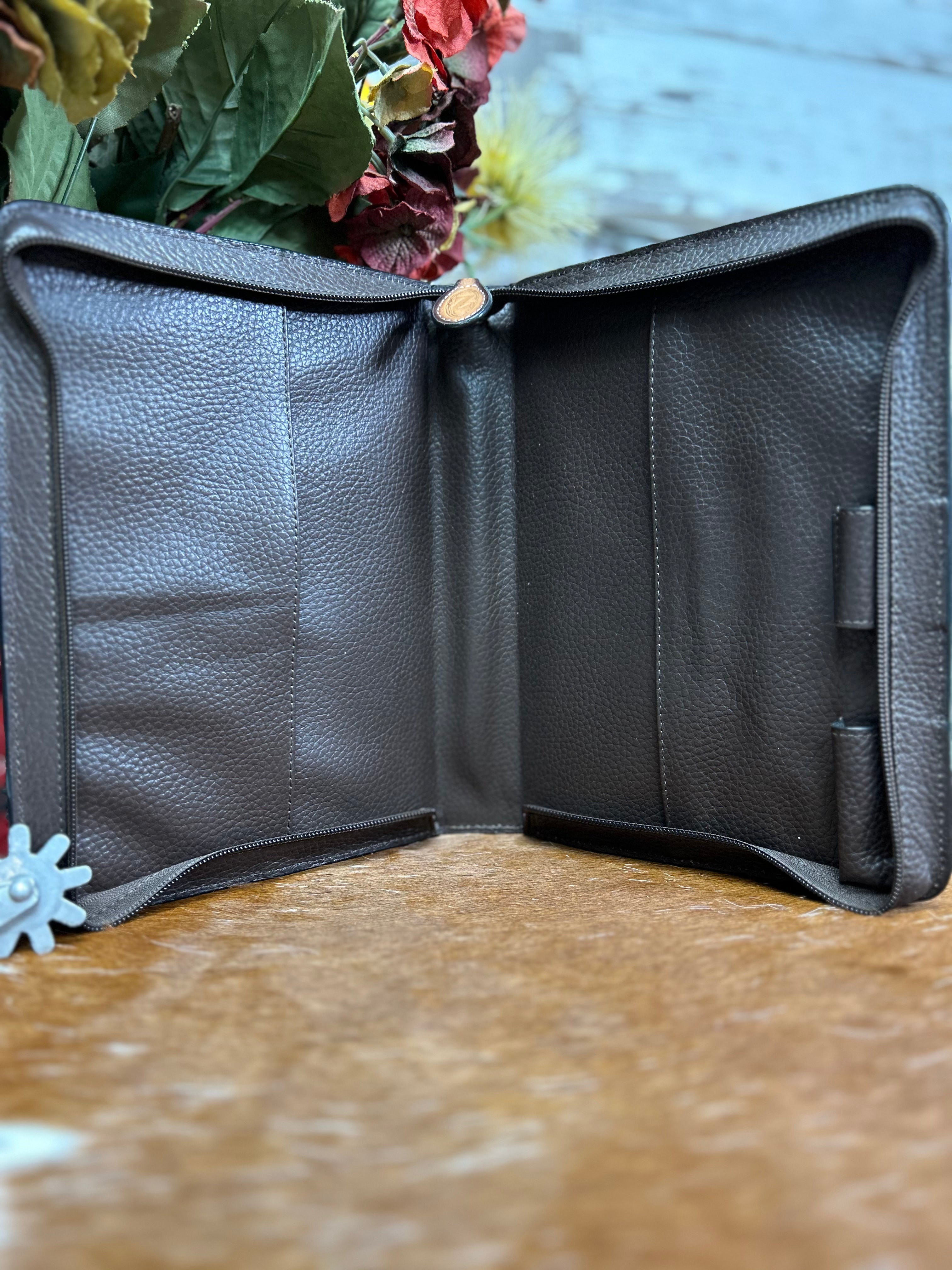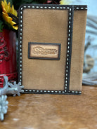 Beautiful Nocona Bible cover by M&F Western Products. The cover features a brown roughout body with burnished edges and white diamond buck lacing around the edges. Boot stitch design in the center. Slide pocket on the back.
