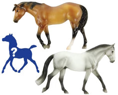 Open the door to reveal the mystery foal surprise! This three piece Stablemates set comes with a stallion, mare, and a mystery foal, whose color is a surprise! This set features a Dun Warmblood and a Black Quarter Horse, and their foal remains hidden in its stall until you open the package! A fun visual lesson in horse genetics; the foal's coat color and pattern will be based upon the coat color and patterns of its parents.
