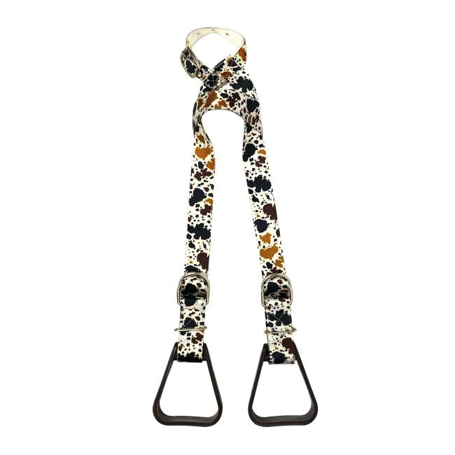 The Showman® Heavy Duty Nylon Adjustable Buddy Stirrups with Cowprint Design are the perfect accessory for young riders looking to add a touch of style and functionality to their riding experience. Crafted from durable, heavy-duty nylon, these stirrups are built to withstand the rigors of daily use while providing a stable and secure footing for the youth rider. The adjustable feature ensures a perfect fit for a range of ages and sizes, making them a versatile addition to any young equestrian's gear.