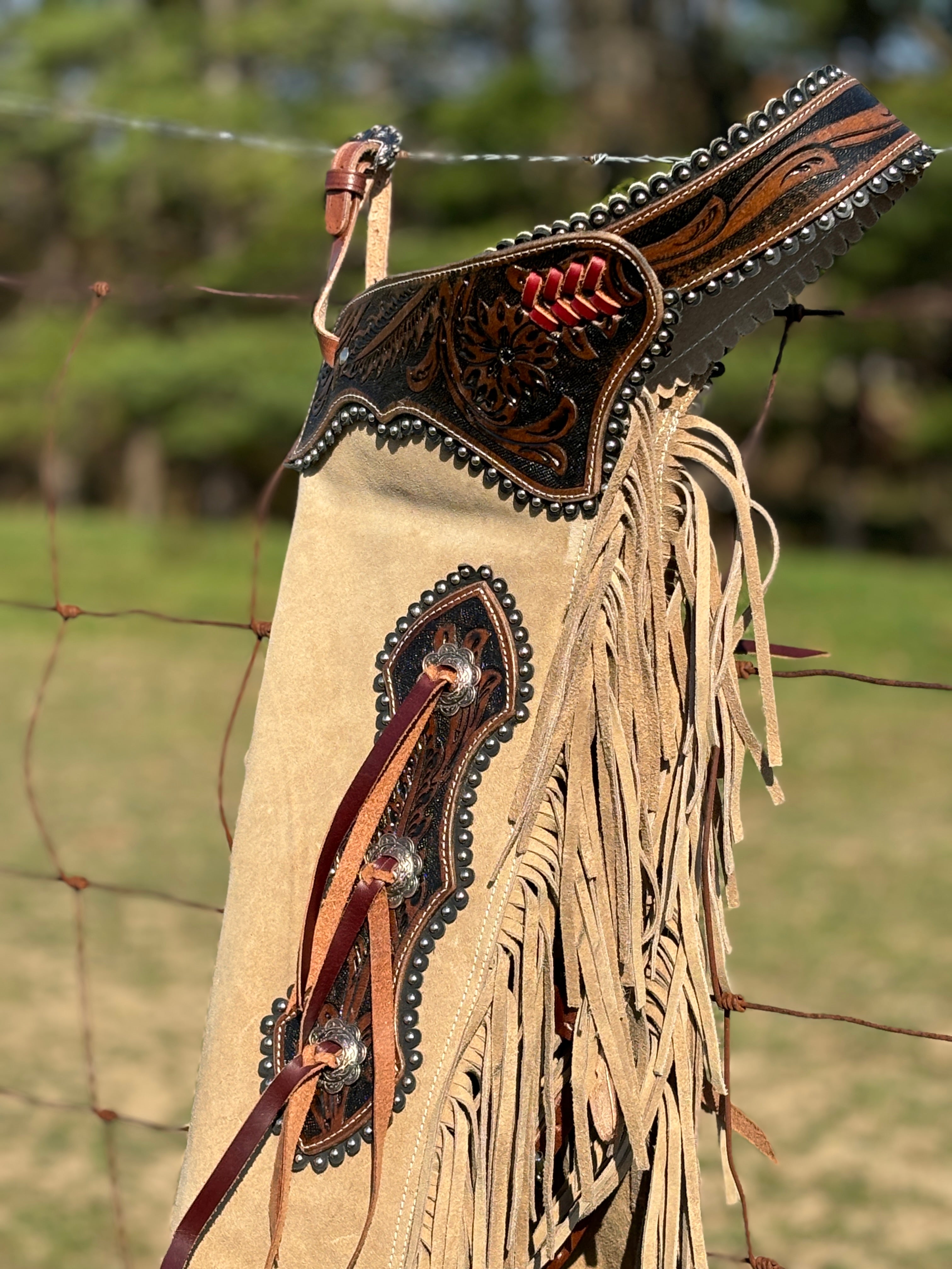 Introducing these Showman® exquisite tan chinks, crafted with the finest floral tooled leather and adorned with stylish fringe details. These chinks are designed to add a touch of Western flair to your outfit while providing functionality and durability for all your riding adventures. The adjustable buckle ensures a secure and comfortable fit, making them suitable for a wide range of sizes. Whether you're hitting the trails or performing in the rodeo arena, these brown chinks are the perfect blend of style and practicality. Elevate your equestrian wardrobe with these stunning chinks and make a statement wherever you go.