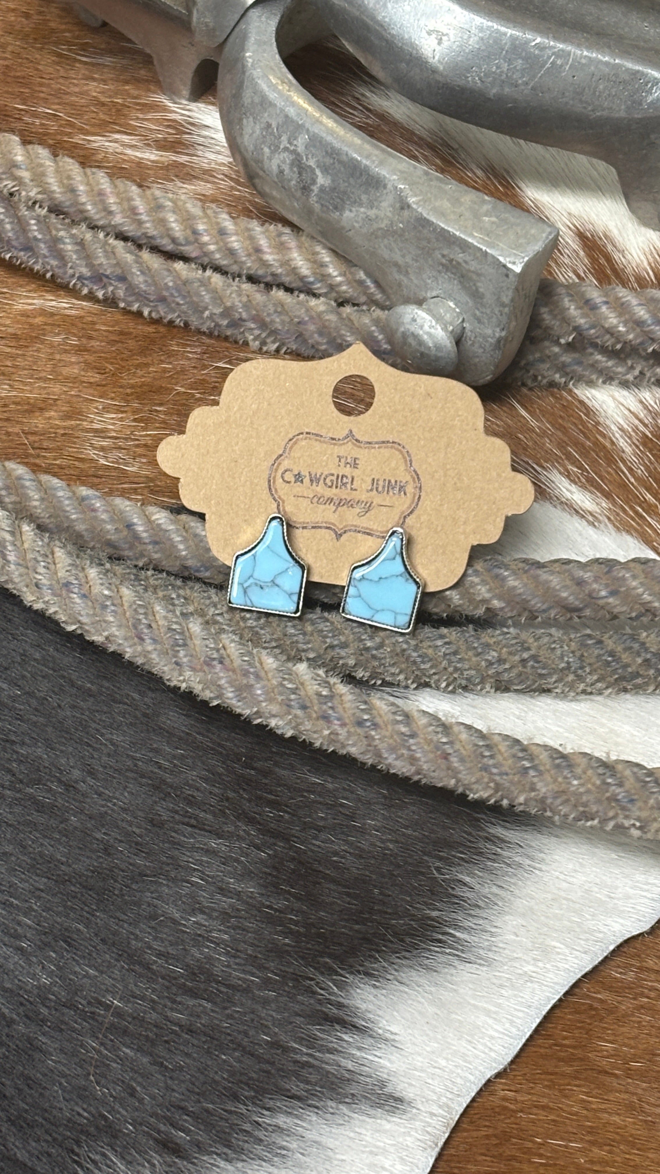 A fun twist on country fashion these earrings are made of faux Turquoise stone. These studs are trendy without the guilt! . Dimensions: Height: .5 inches Width: .5 inches