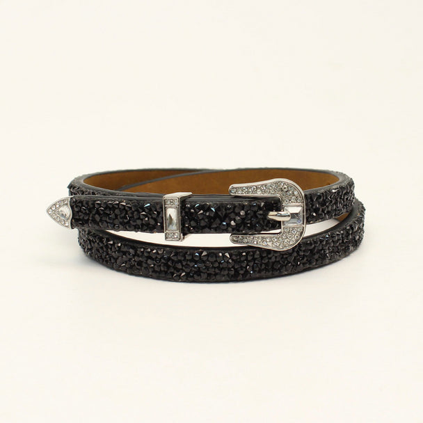 3D hatband by M&F Western Products. Band has large black clustered rhinestones and a 3 piece buckle set that is accented with clear rhinestones. Measures 27" long.