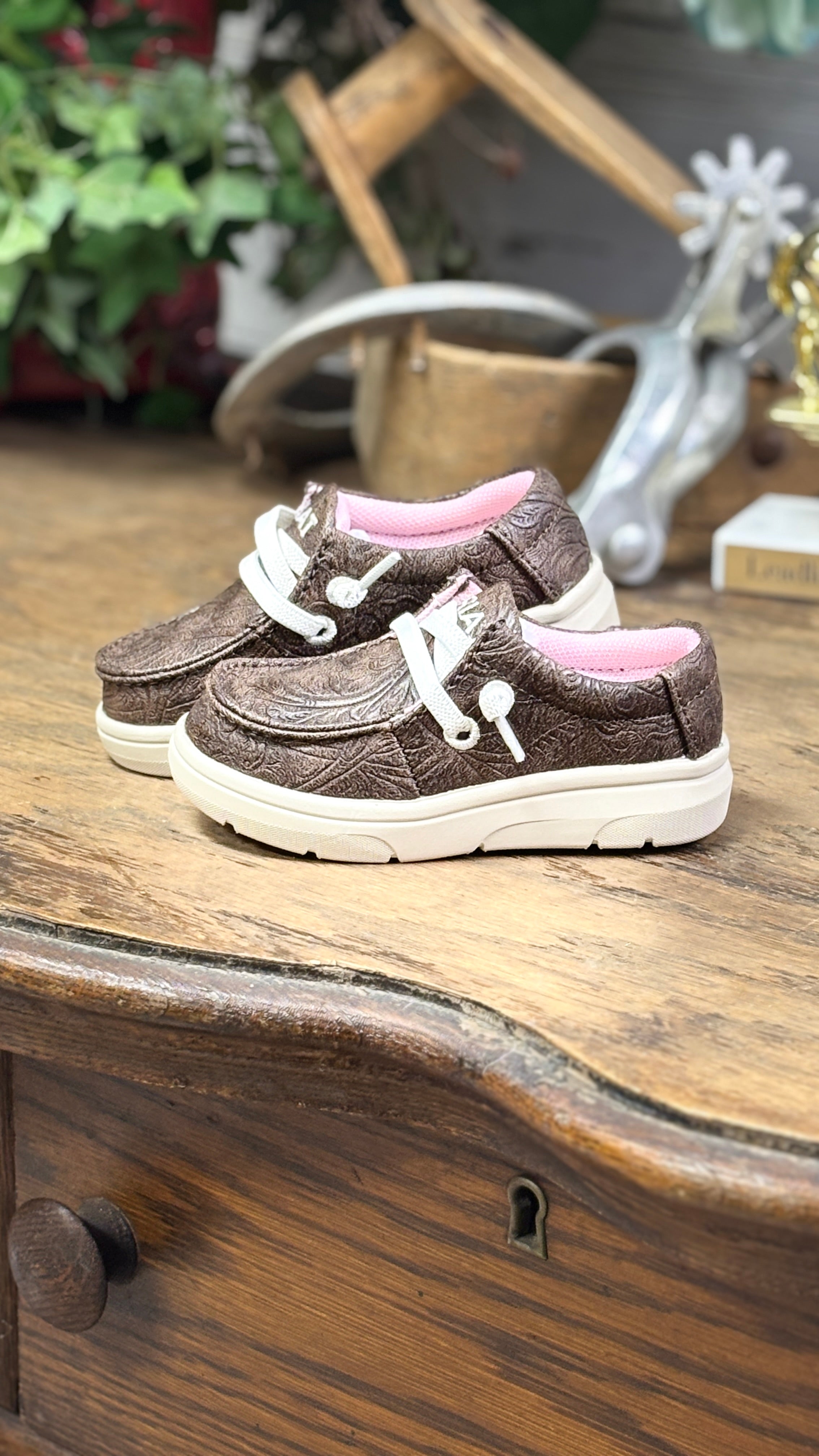 All day fun in these Ariat LIL’ Stompers kid's casual shoes by M&F Western Products. Dark brown floral embossed upper. Durable rubber outsoles. Easy to get on and off. Super comfortable for all day wear.
