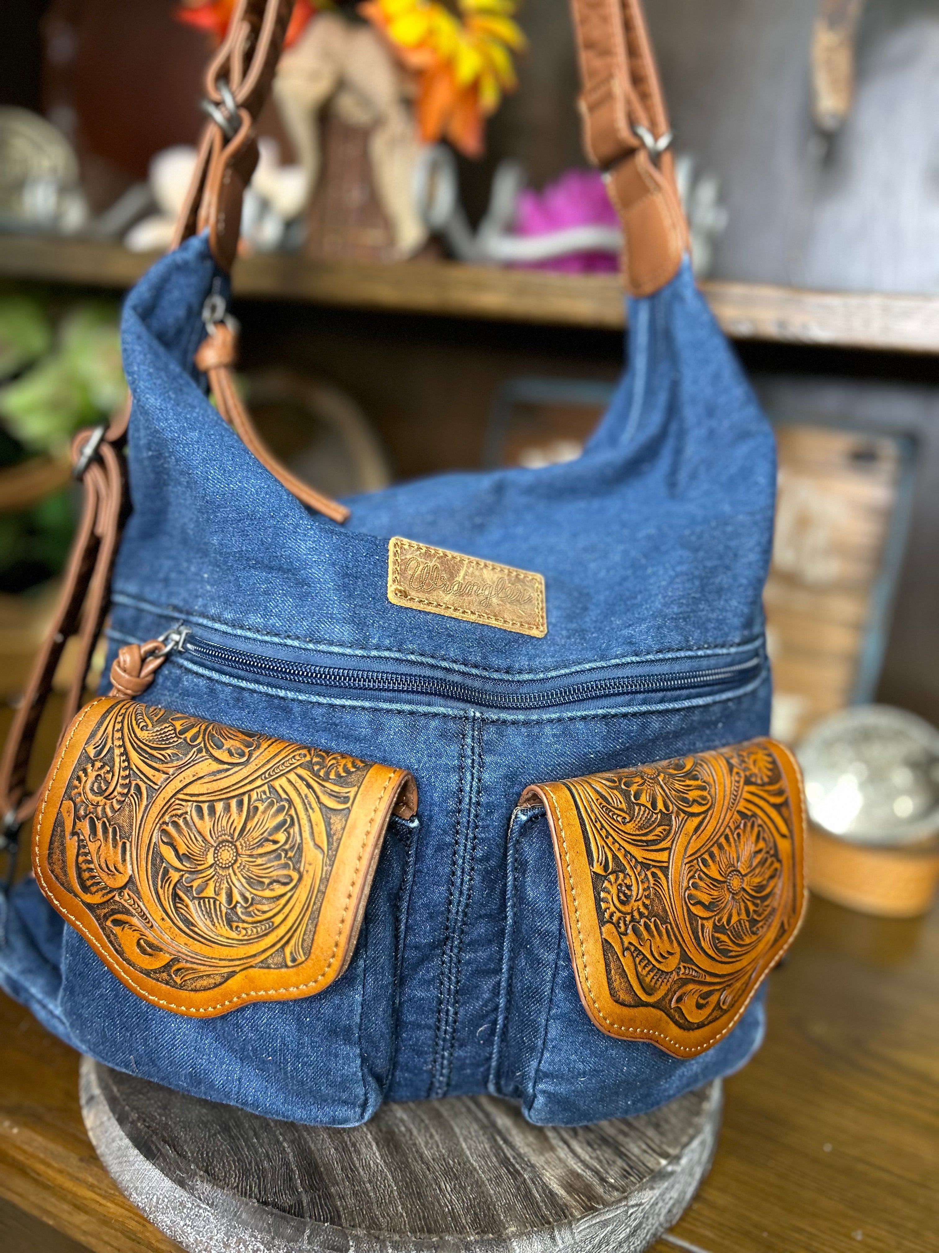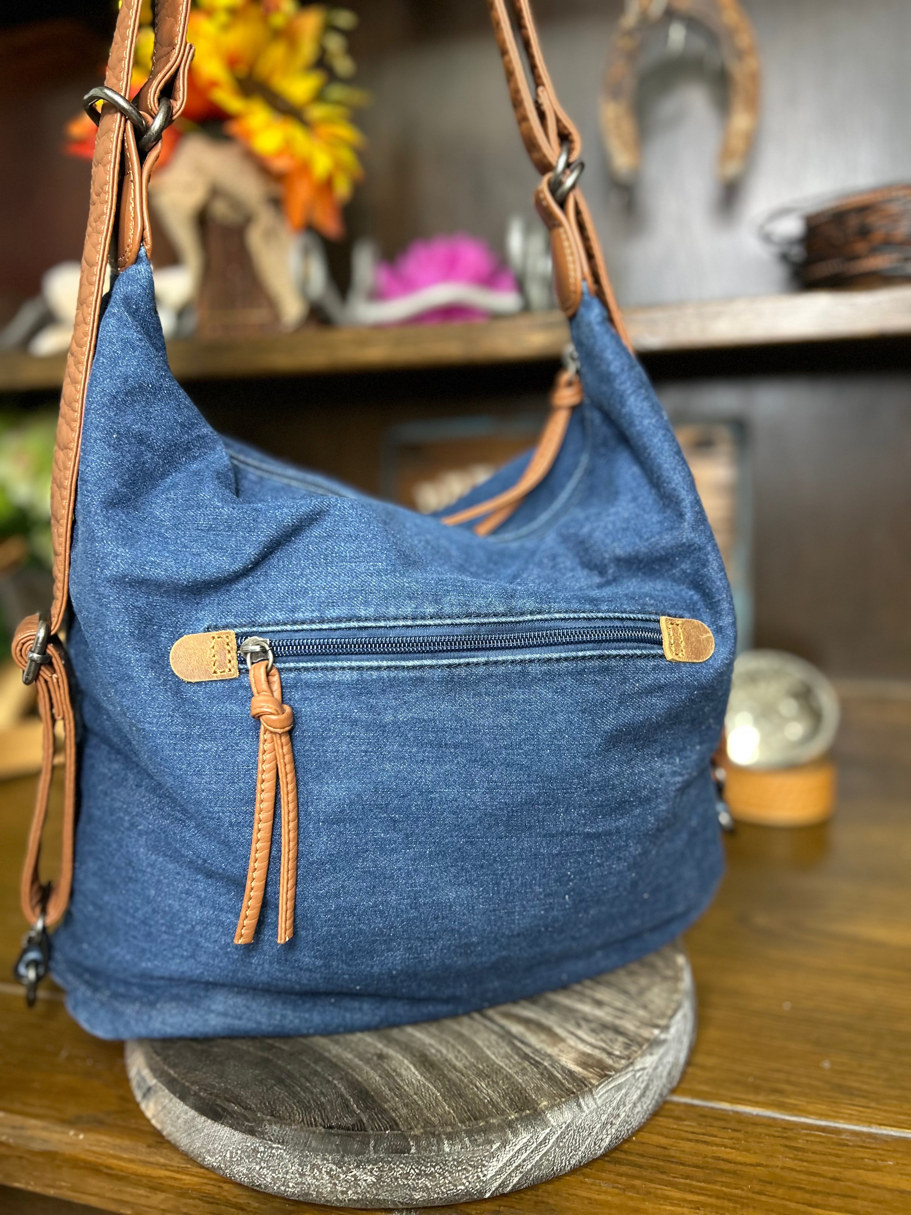 Made of denim jean and PU leather this convertible shoulder bag has: