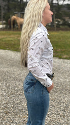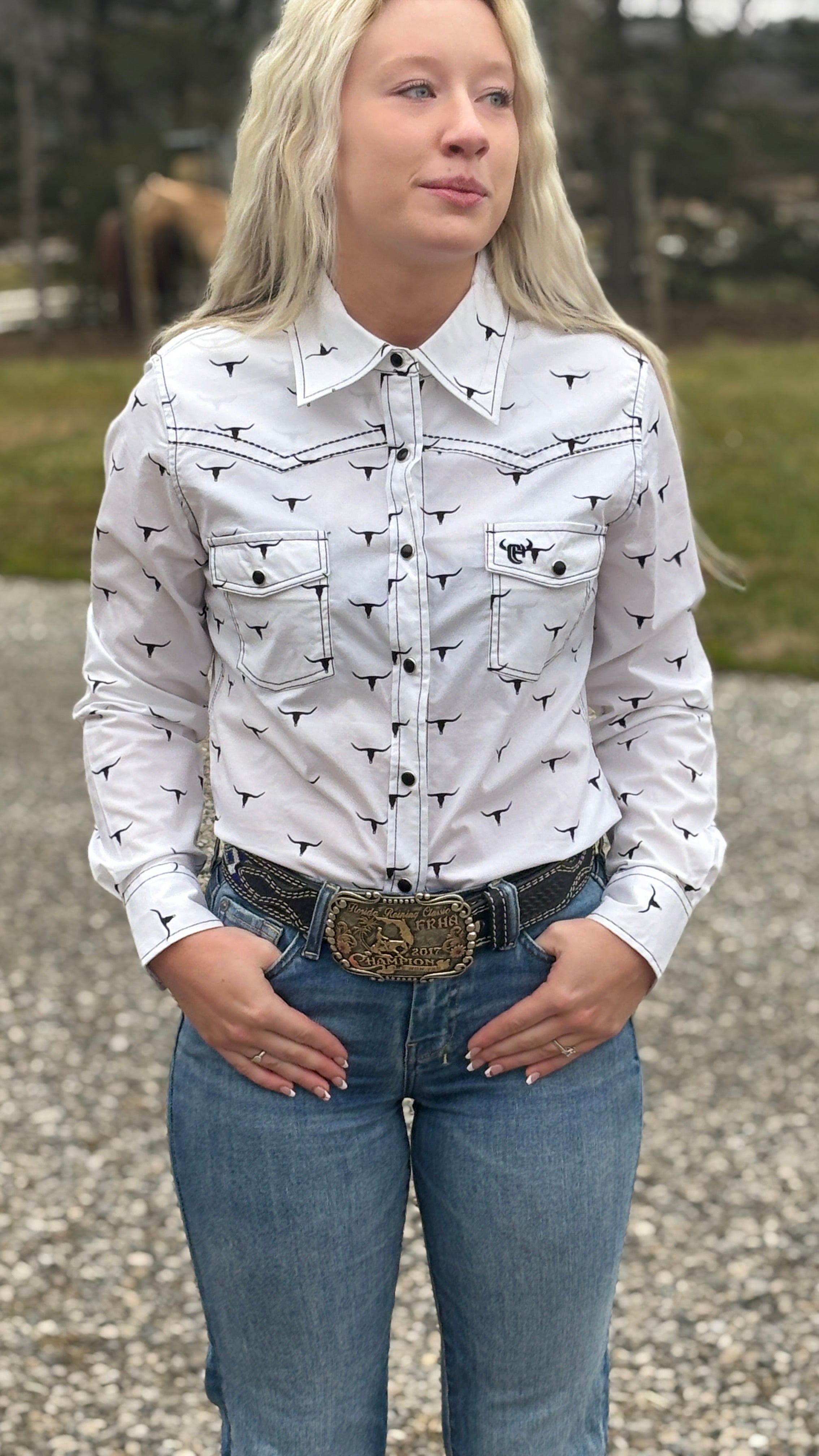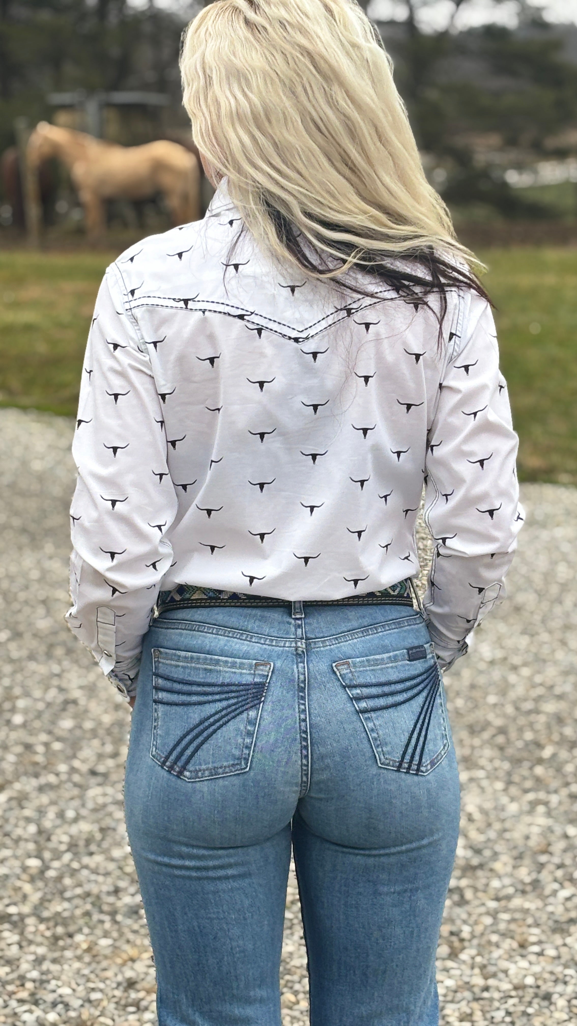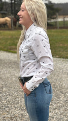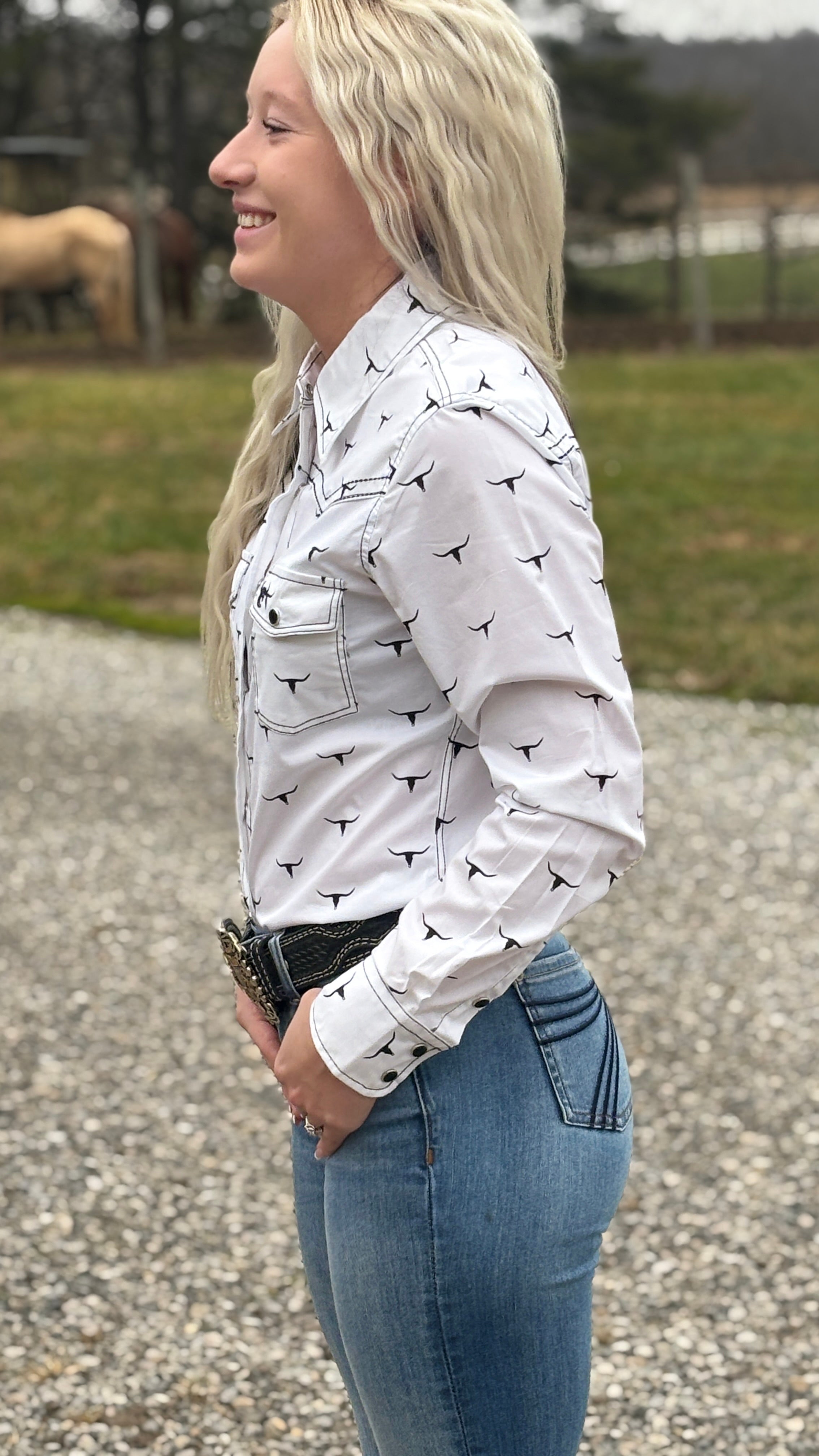 This striking white snap shirt is covered in an all-over longhorn print, bringing a fearless ranch vibe to a sleek, tailored silhouette. Contrast stitching, pearl snaps, and western yokes give it that signature Cowgirl Hardware attitude-strong, stylish, and ready to ride.