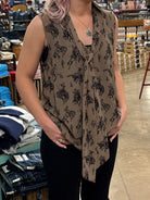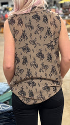 Bucking Horses Print Tie Front Sleeveless Woven Contemporary Top. Mocha color, true to fit 95% Polyester 5% Spandex