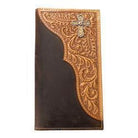 This Nocona rodeo wallet by M&F Western Products has a crazy horse leather body with an embossed corner overlay and Cross concho. Multiple card and cash slots, checkbook slot and ID window on the inside.