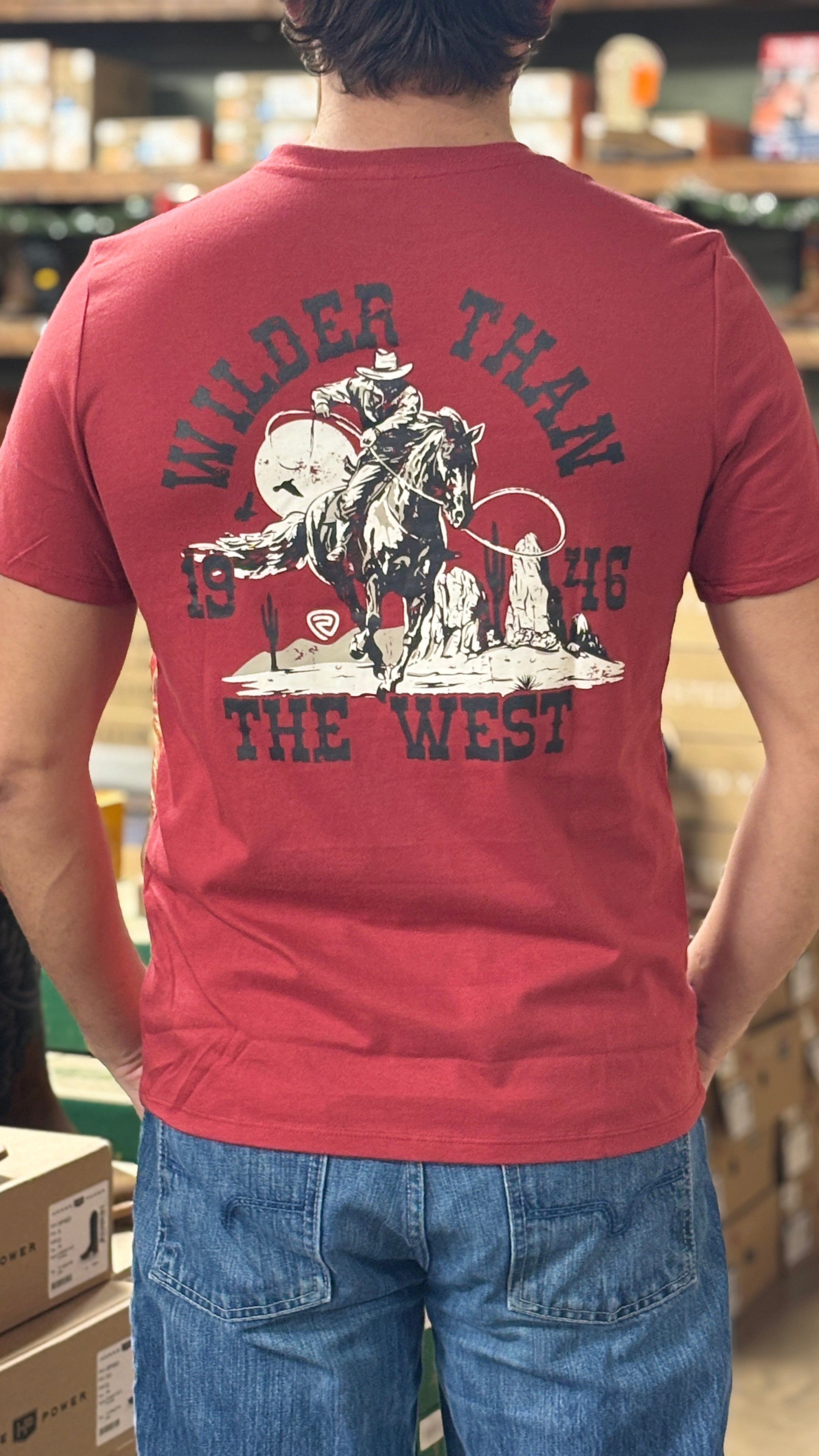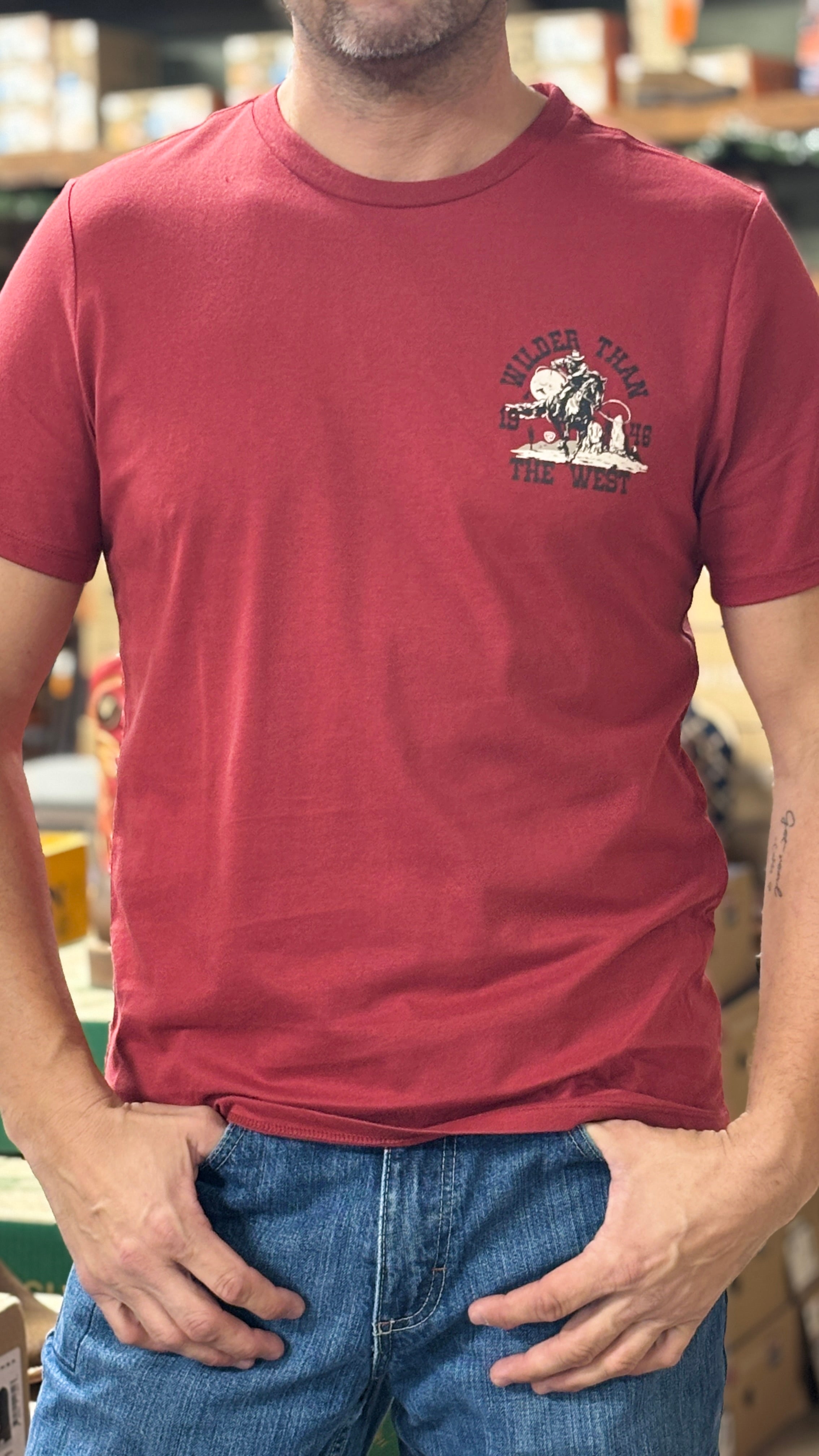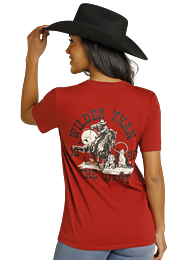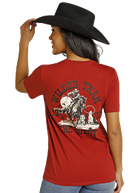 Rock & Roll Denim works hard to dress your inner rock-star so that you shine. Bronco Rider graphic tee in Scarlet.
