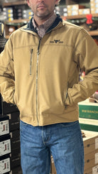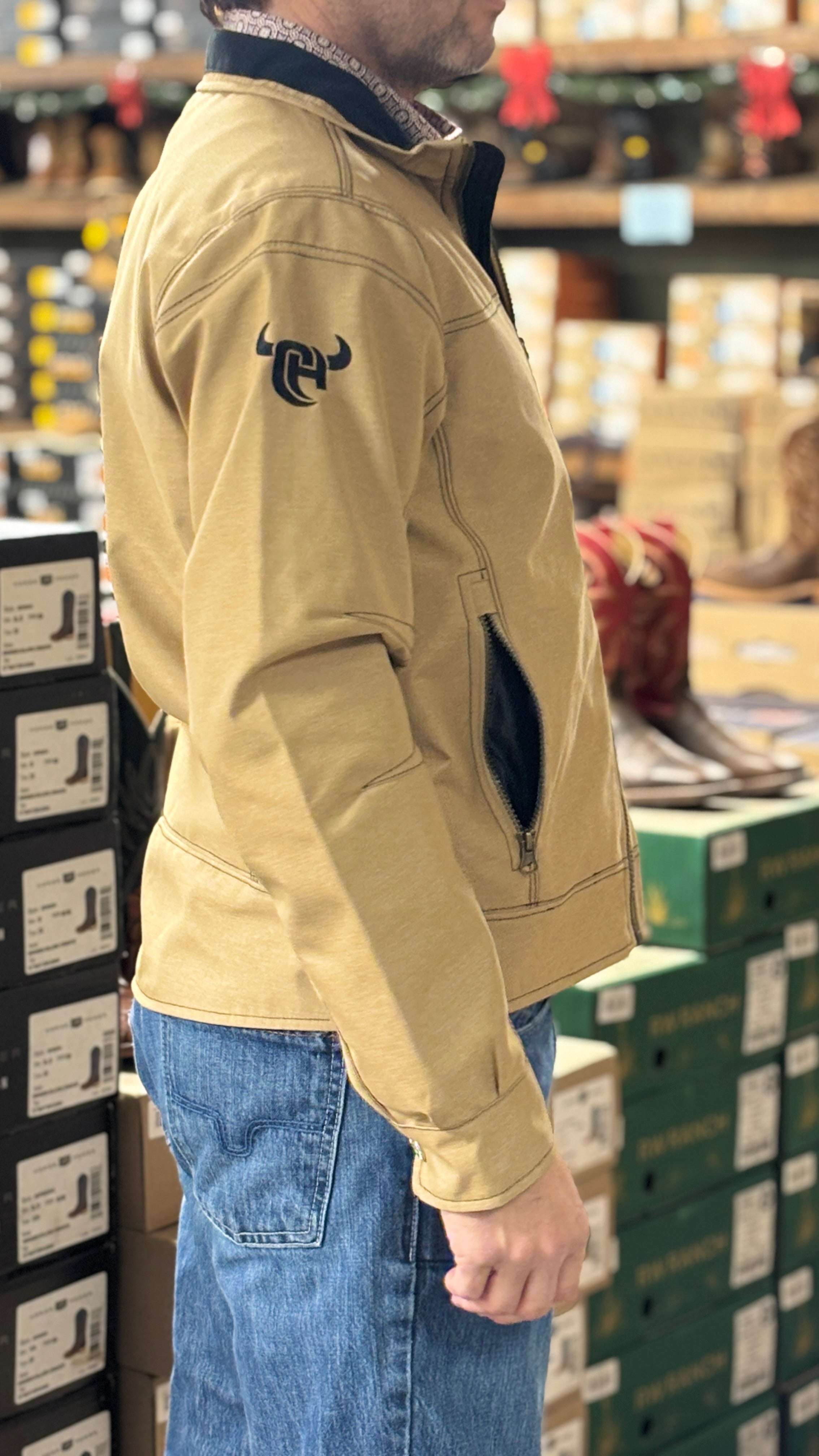 The Men's Bar CH Buckskin Tech Jacket from Cowboy Hardware combines rugged style with modern functionality. This tan jacket features a sleek black zipper, making it a versatile addition to any wardrobe.