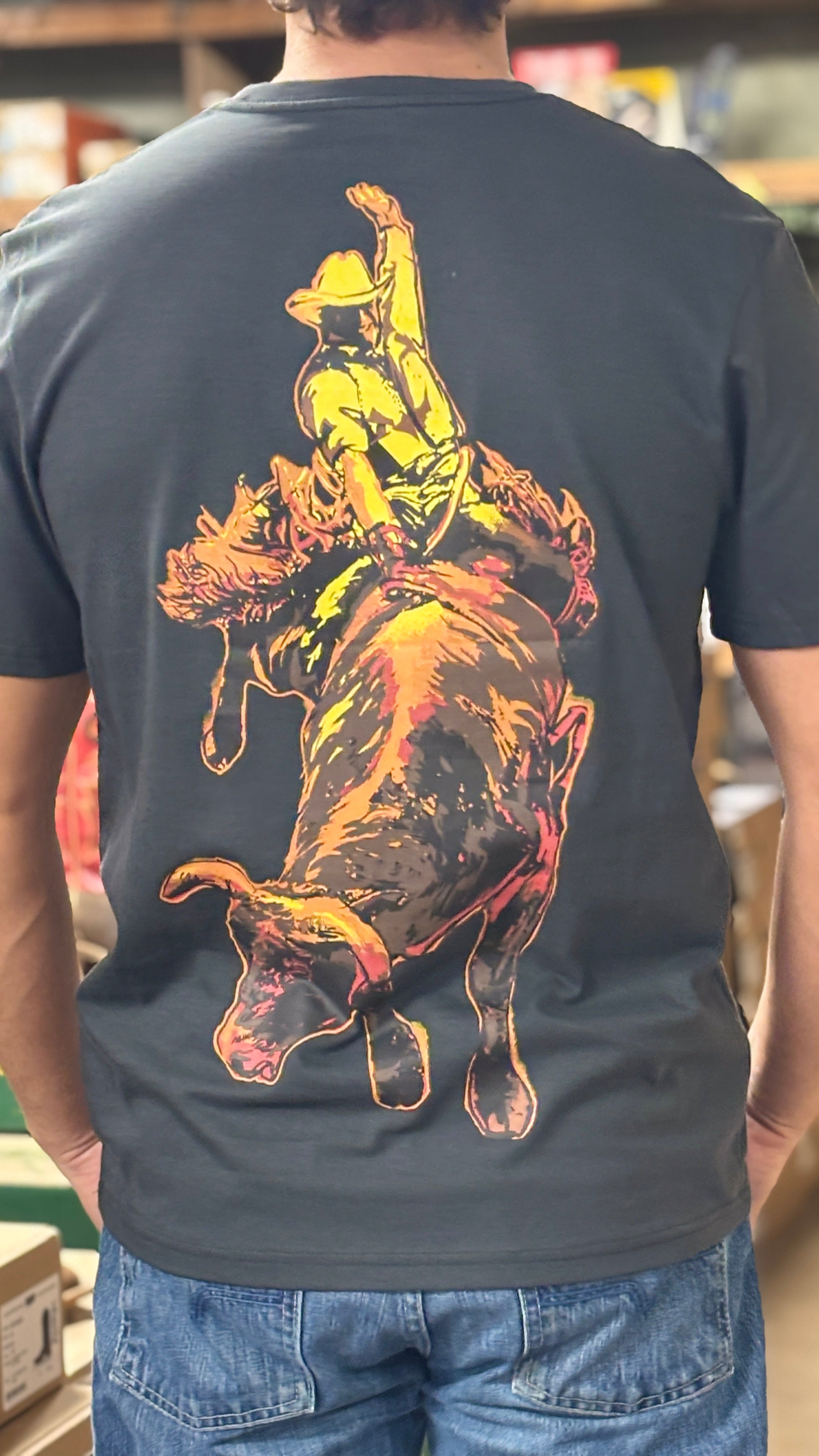 Every move you make on the back of a bucking bronco has to count. Start rodeo season off on the right foot with our screen-printed short-sleeve t-shirt. Inspired by one of the roughest sports in rodeo, this men's tee comes with a splattered design of a saddle bronc riding pro in his element, showing what it takes to last eight seconds on the back of a formidable opponent. It also comes with the official Wrangler® logo for a stamp of authenticity.