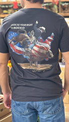 Grab those reins and get ready to ride with this Wrangler® Reissue Right to Rodeo T-Shirt. Across the back, it comes with an eye-catching graphic print of a cowboy on the back of a bucking bull, silhouetted against a flag-filled outline of the United States. This classic crewneck tee is crafted from 100% cotton and cut with a regular fit that always feels just right.