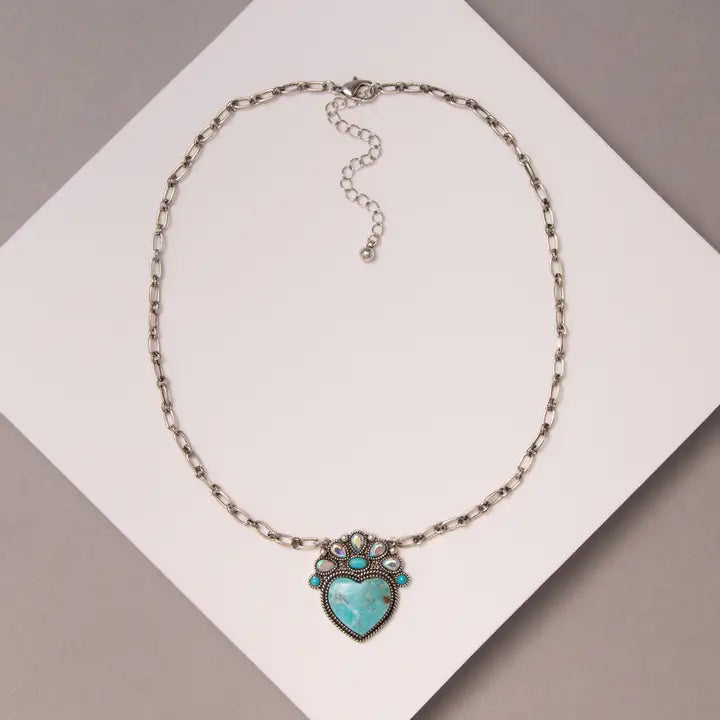 Key Features: A charming Western-inspired necklace featuring a beautifully crafted heart pendant set with a luminous glass stone. The detailed metalwork and polished finish evoke rustic romance and frontier spirit, while the smooth drop silhouette adds a touch of refined elegance. Lightweight and adjustable for everyday comfort, this piece blends heartfelt symbolism with classic Western styling. Perfect For: Rodeos, country concerts, cowgirl gatherings, festivals, and daily Western wear. A thoughtful gift for country music fans, sentimental partners, collectors, and Western jewelry lovers. Ideal for boutiques, rodeo vendors, souvenir shops, and retailers seeking a sweet, versatile Western accent for any wardrobe.