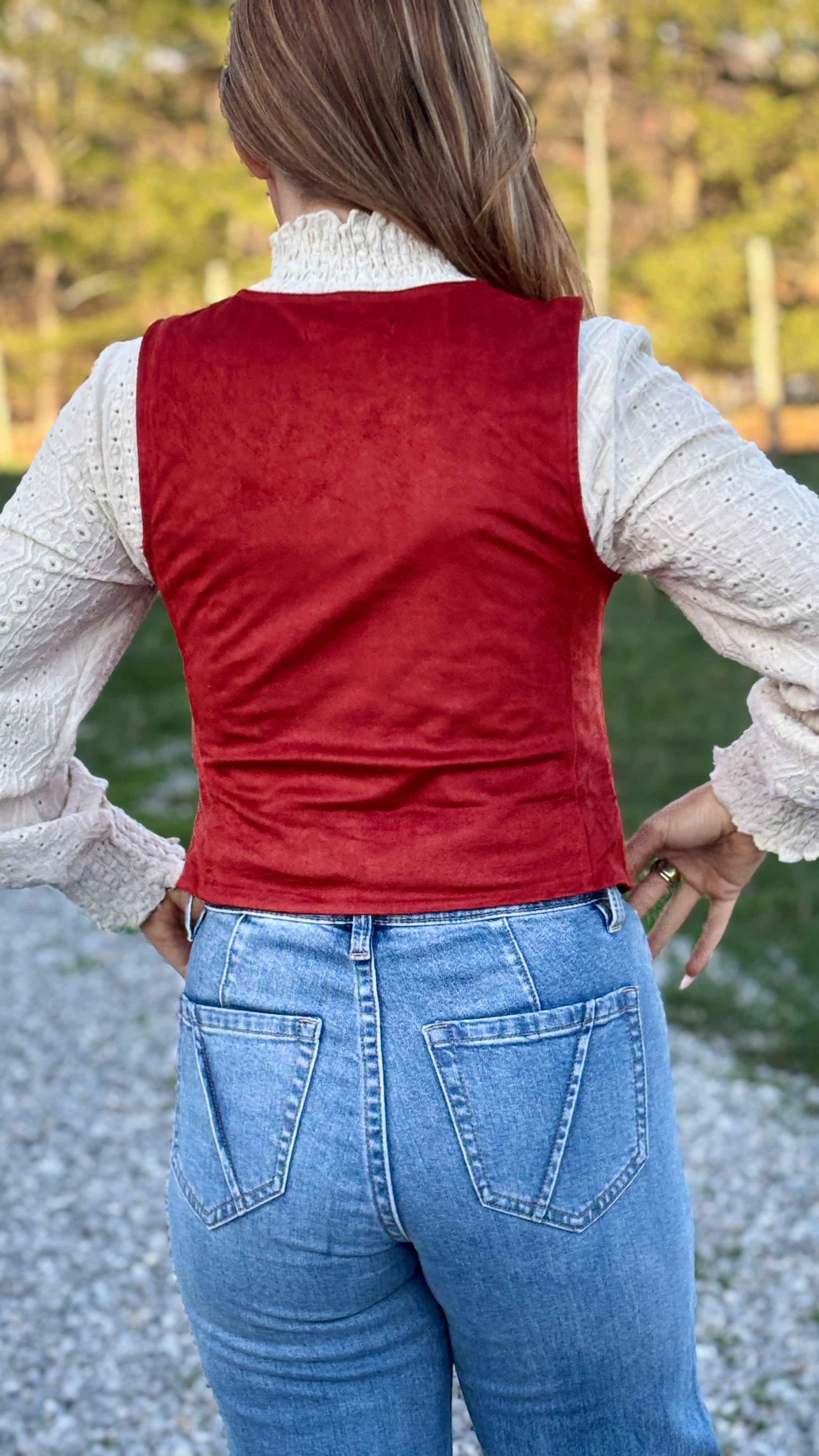 This vest has everything and more, fabulous! This is a Rust microsuede vest by Rock & Roll.