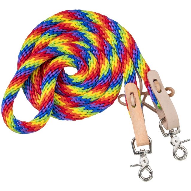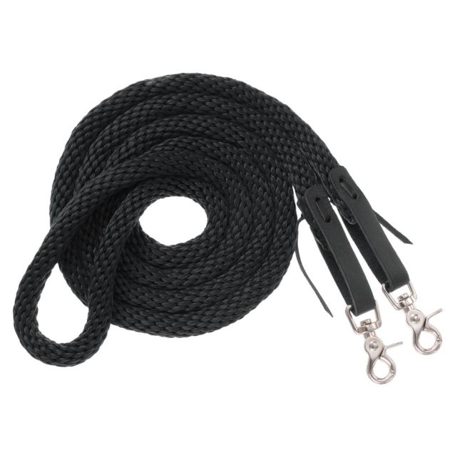 These quality western roping reins are made from durable, easy-to-clean polypropylene. They feature scissor snap ends with leather waterloops for easy on/off. Great for everything from contesting to roping to just every day riding.
