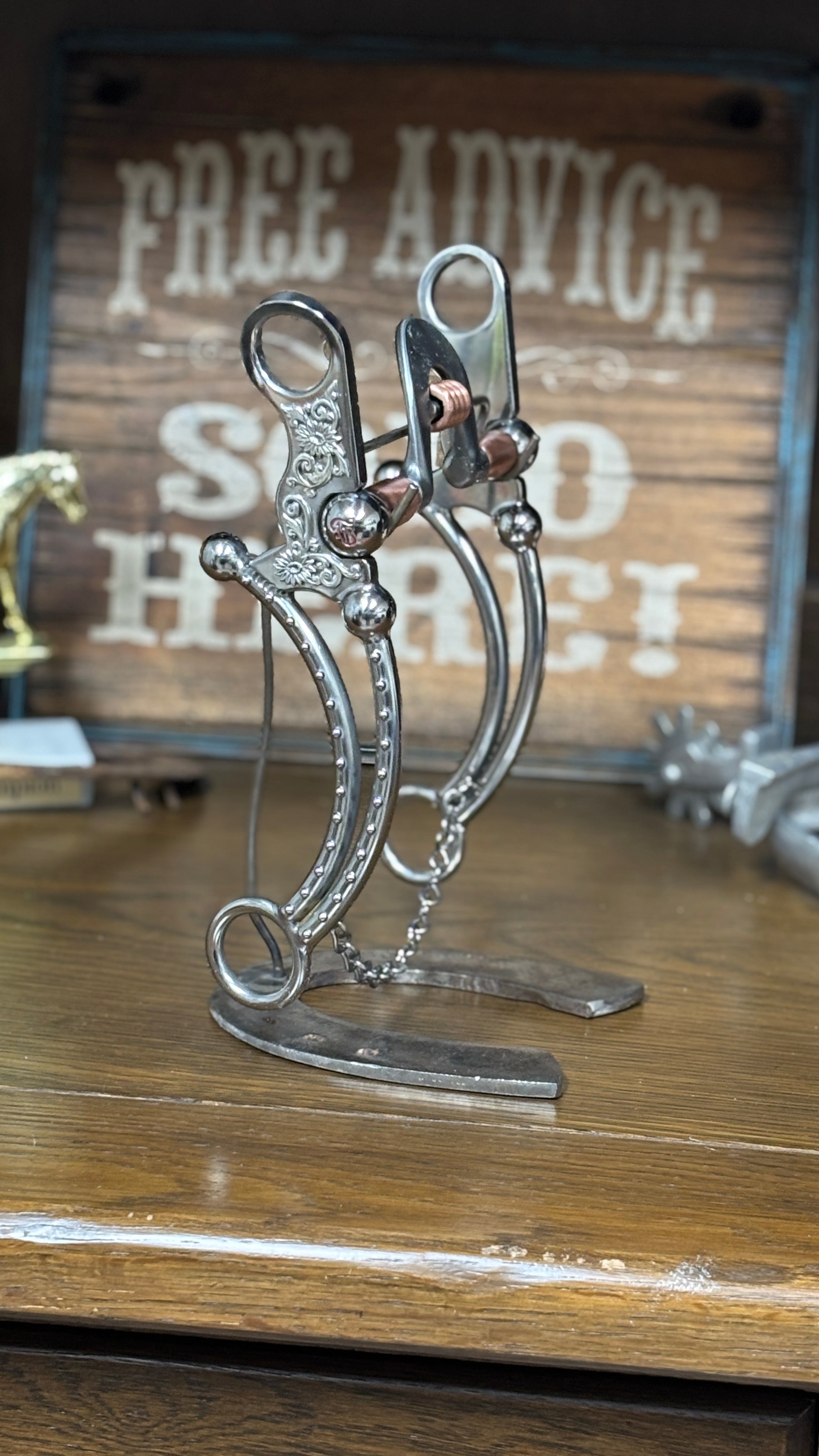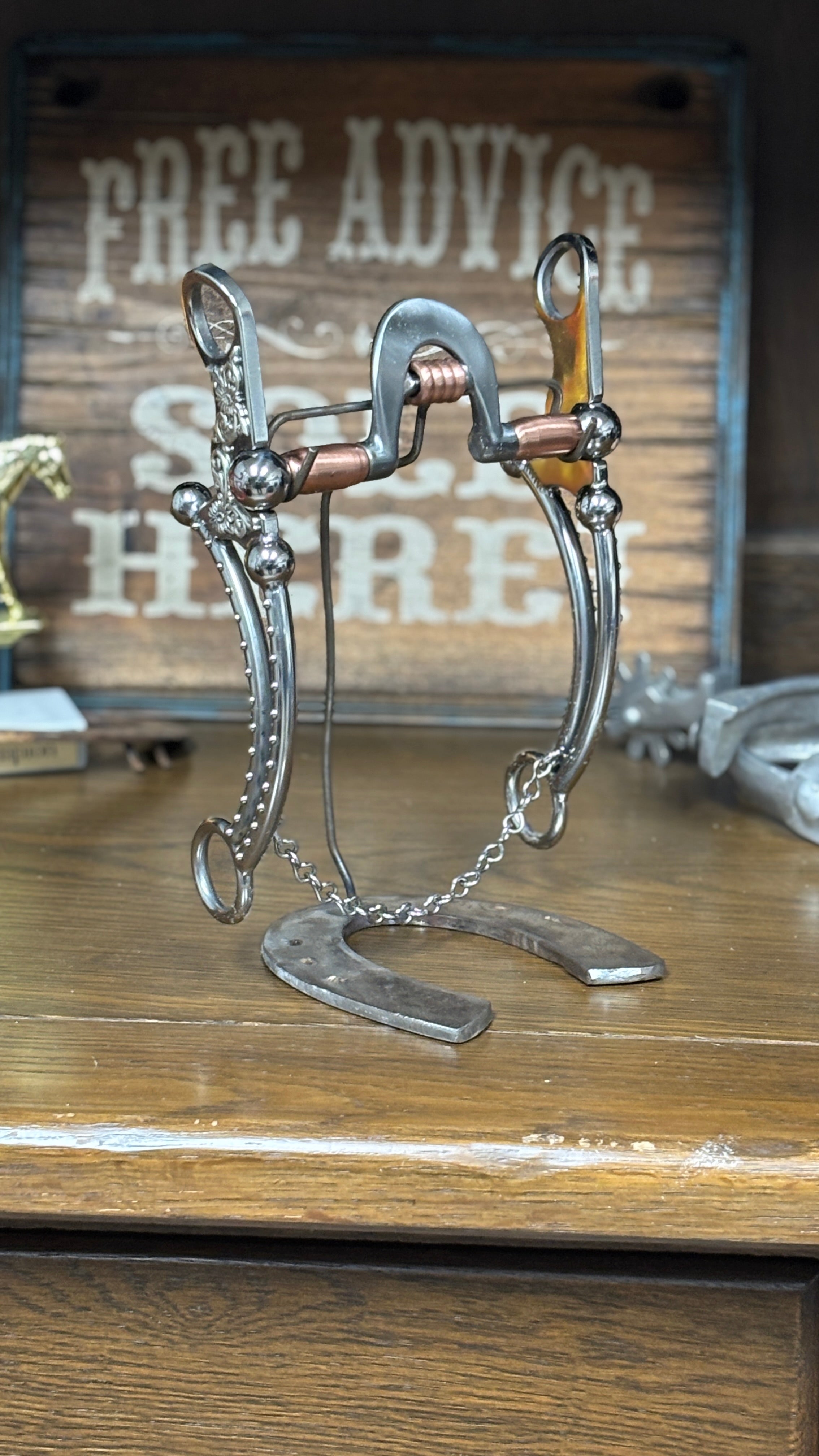 This beautifully crafted bit features a K2© shank in brown and stainless steel with floa and dots. The mouthpiece is our Equalizer© with a copper roller. This shank measures 8 1/4".