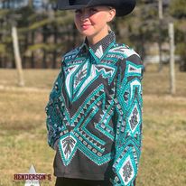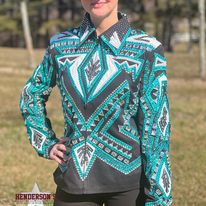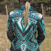 ROYAL HIGHNESS Showmanship Jacket with Teal, Crystal and Pearl Sequence appliques Black fabric has a stretch for comfortable fit and riding Moisture wicking and Breathable fabric Stones are hand sewn and glued Full front heavy duty YKK zipper Dry Clean only.