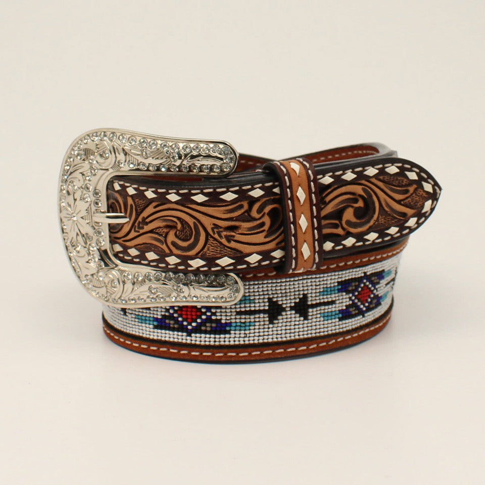 Angel Ranch Ladies belt by M&F Western Products. Striking Angel Ranch Ladies belt. Brown leather strap with pierced floral hand tooled tabs. Beaded inlay in a southwestern pattern on the strap of the belt.