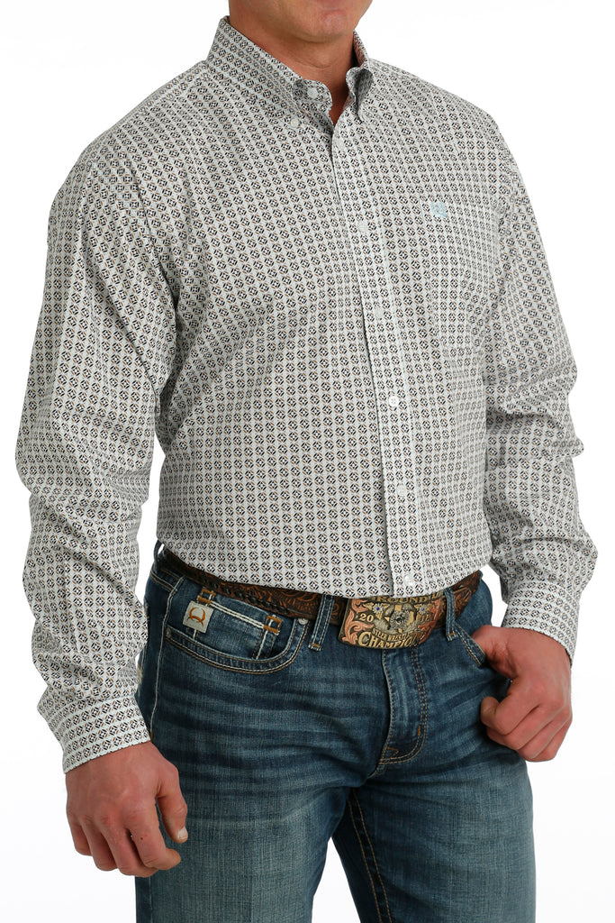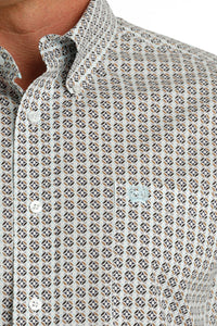 Since 1996 Cinch has been creating distinctive timeless styles that have become the new standard. Premium grade cotton for exceptional strength and finish. Exclusively designed in the USA. Cream with tan print shirt with long sleeves, circle buttons, open chest pocket, straight back yoke, and a button down collar.