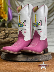 These Kids Macie Bean Unicorn Cowgirl Boots appeal to the girly side in your little cowgirl! This feminine styled boot features a Pink sinsation vamp with a White glove Unicorn print top for a vintage feel. This boot also showcases a square toe leather outsoles and walking heel Named grandmother Macie Bean boots have become a favorite among cowgirls Macie Bean boots are handcrafted in Leon Mexico with all leather construction. They are great boots that have eye appeal offer tremendous level of comfort and are wonderful for casual wear.