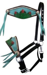 Showman ® Adjustable black nylon bronc halter with painted cactus and 3D flower designed nose band. This halter features a wide bronc style nose band with a hand painted cactus and 3D flower design with teal inlay. Halter is equipped with nickel plated hardware and eyelets.