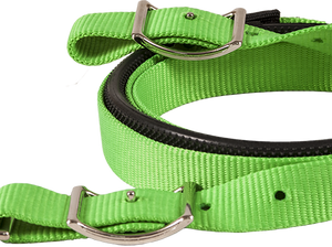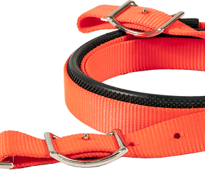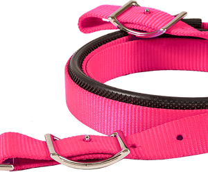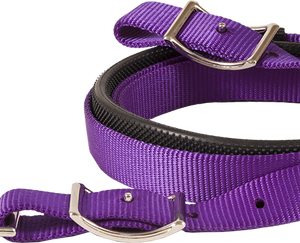 1” wide nylon webbing contest rein with rubber grip handle and one nickel plated trigger snap.