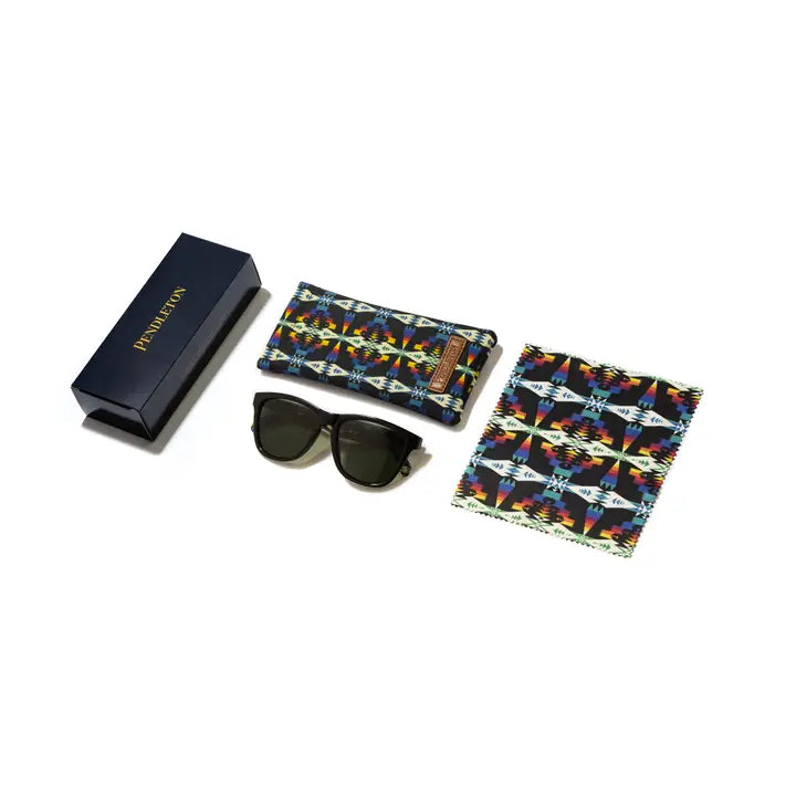 Never wear boring sunglasses again. Recycled frames and polarized lenses meet iconic Pendleton western patterns in this collection. Also available in Orange Crystal and Emerald Crystal * Made from recycled water bottles * TAC Polarized lens offers 100% UVA/UVB protection * Includes matching Pendleton travel case and cleaning cloth * Measurements: 54/17/134 mm (lens/bridge/temple)