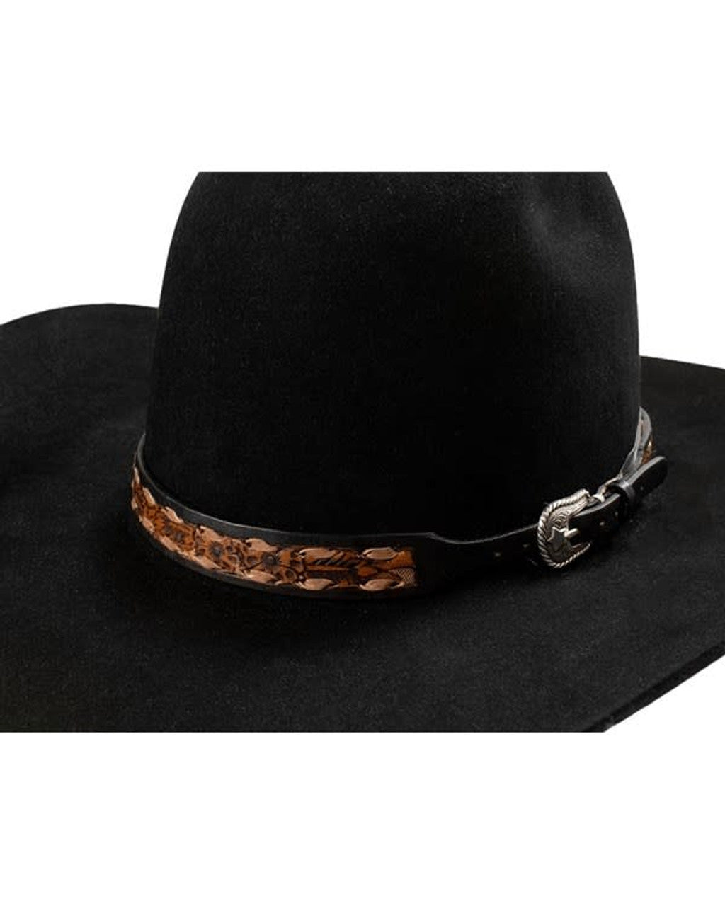 Dress up your favorite hat with this Twister hatband by M&F Western Products. Light brown calf hair body accented with laser cut scrolling pattern. Antique Silver buckle with a raised engraved star with rope edge.